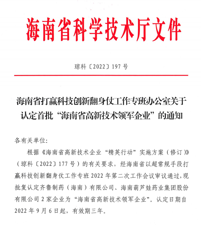 近日,海南省科学技术厅发布的《海南省打赢科技创新翻身仗工作专班办公室关于认定首批“海南省高新技术领军企业”的通知》中显示,批复认定海南asiagame药业集团股份有限公司等2家企业为“海南省高新技术领军企业”。认定日期自2022年9月6日起,有效期三年。